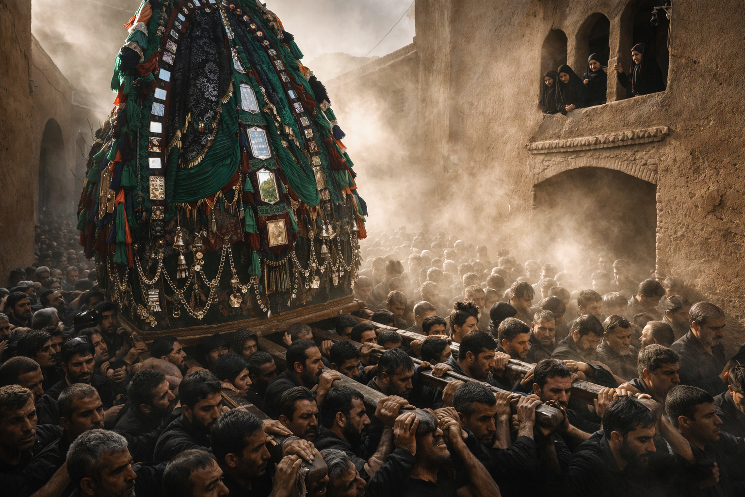 En el desierto central de Irán, en la histórica ciudad de Yazd, cada año en el décimo día del mes de Muharram, ocurre una escena que pocos lugares en el mundo pueden igualar. Una multitud de dolientes carga sobre sus hombros una enorme estructura de madera que pesa varias toneladas, mientras el grito rítmico de “¡Ya Husein!” resuena entre las estrechas callejuelas de barro. El polvo del desierto se mezcla con las lágrimas, y la atmósfera se carga de una emoción difícil de describir con palabras.